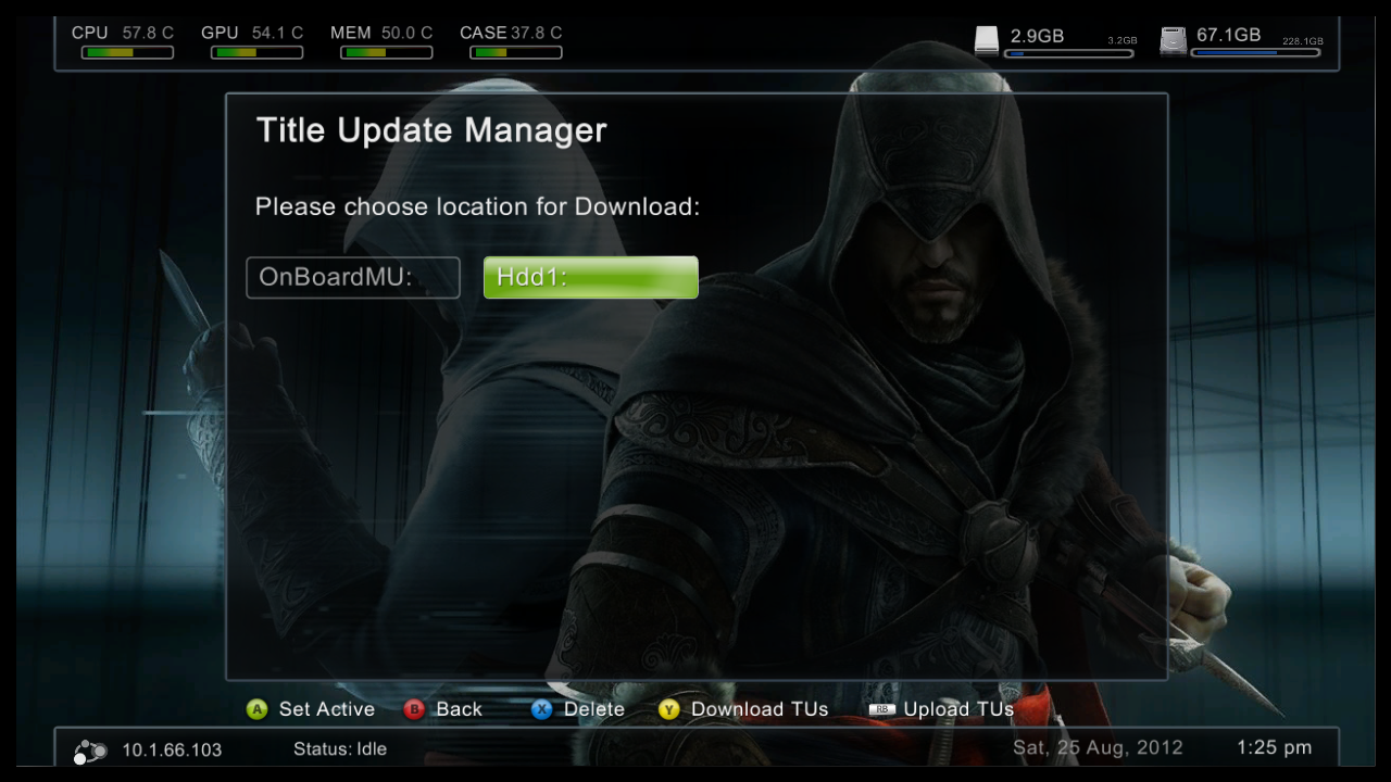 Apasati pe Y (Download TUs) si va apare o fereastra care va va cere sa selectati locatia unde sa le downloadeze. Selectati HDD1 si apasati A: